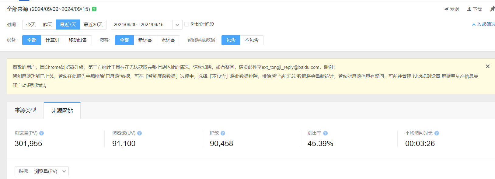 2024年9月15日22:45分网站统计数据截图及最近7天数据截图,数据来源百度统计
